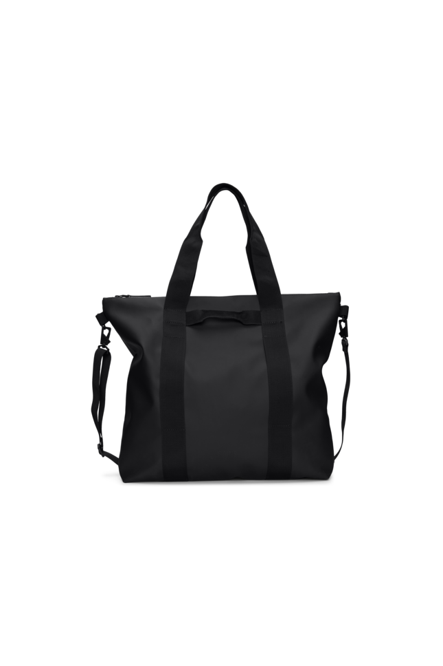 Black tote bag from RAINS. Features sturdy handles and a removable shoulder strap for versatile use. A spacious main compartment with a zipper closure. The minimalist design is accentuated by subtle black stitching.