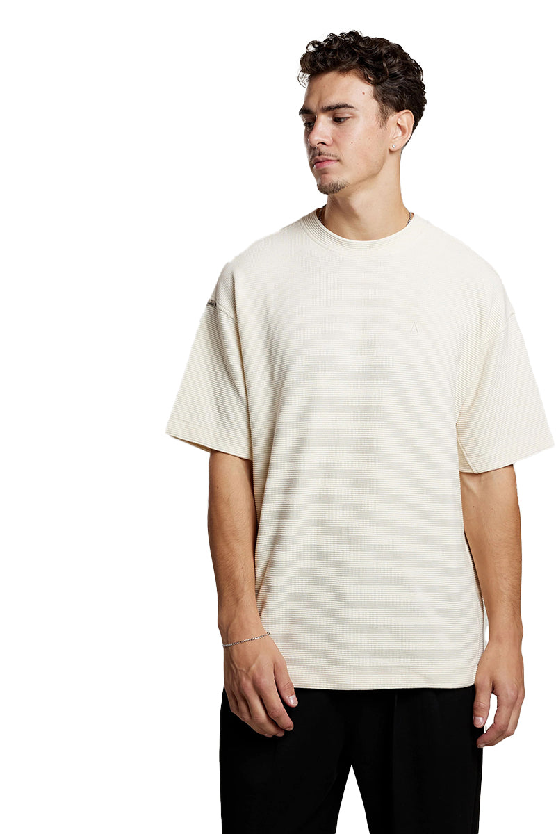 The AEDEN Joon Tee T-Shirt is a wardrobe essential, crafted from 100% cotton with a distinctive waffle weave. It has a relaxed, oversized fit with dropped shoulders and short sleeves. The AEDEN logo is discreetly embroidered on the chest. This off-white shirt offers a comfortable, contemporary base for any casual outfit.
