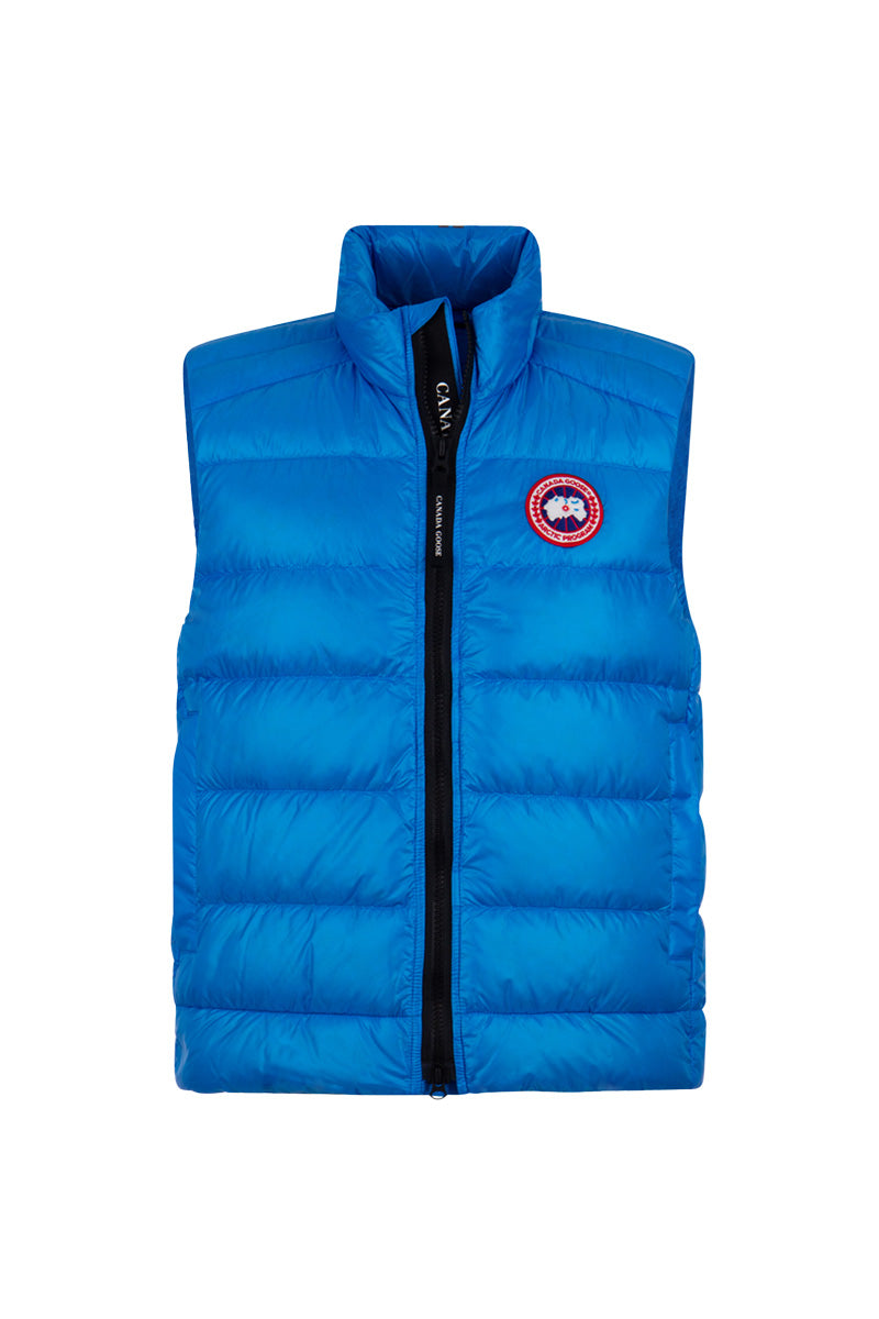 Packable Crofton men's bodywarmer, color 1265 Glacier Blue, from Canada Goose. A lightweight, comfortable slim-fit bodywarmer that easily packs into its internal pocket for travel or warm summer days. A durable, ultralight fabric with ripstop construction is designed to withstand strong winds, light rain, and snow. Made from 100% recycled nylon with a water-repellent finish, it stays dry and comfortable in unpredictable weather.