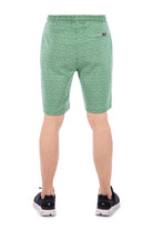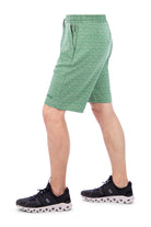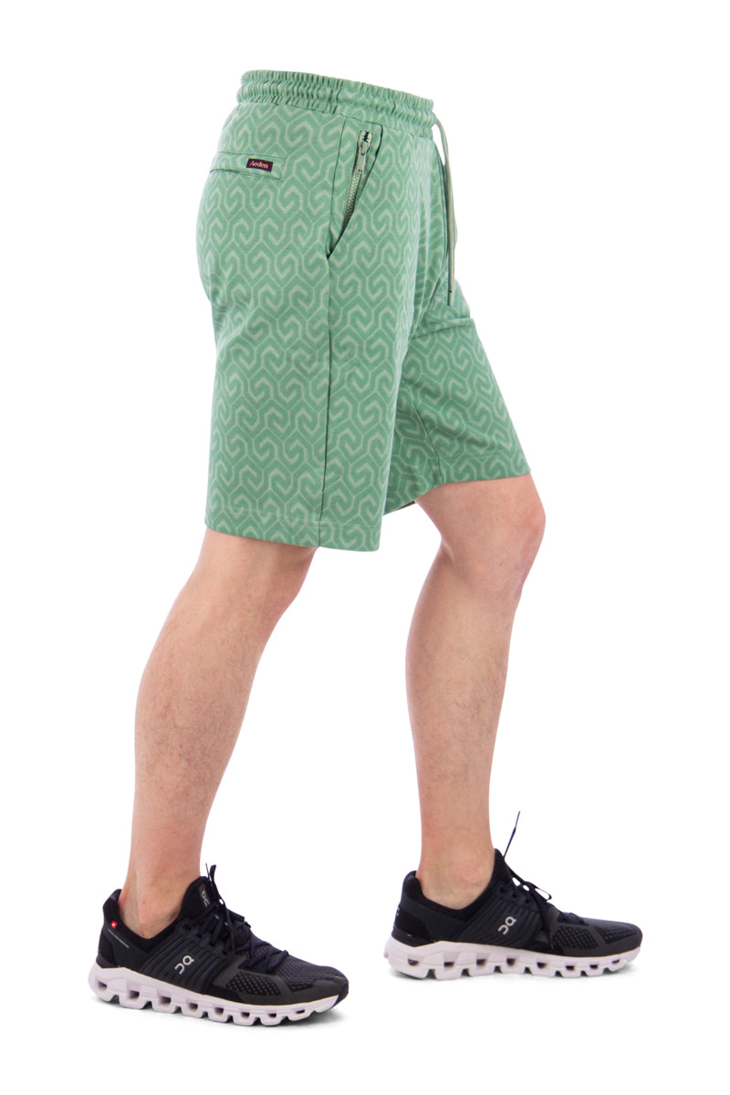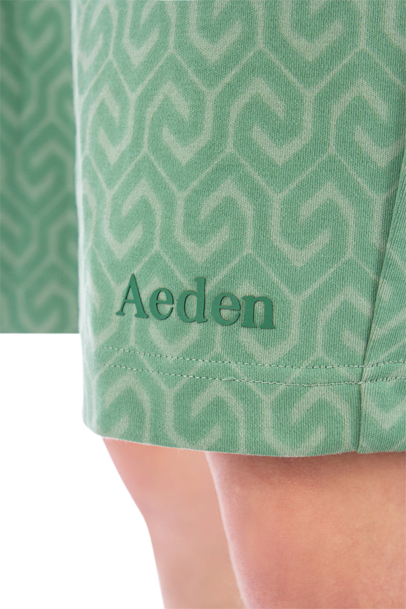 Men's Aeden shorts, Vaughn, in Mid Green/Light Green. These shorts from the Dutch brand Aeden feature an all-over print and logo. They also have two side slit pockets and a smaller zippered pocket. The shorts have a regular fit. Finally, the Aeden logo is embroidered on the back pocket.