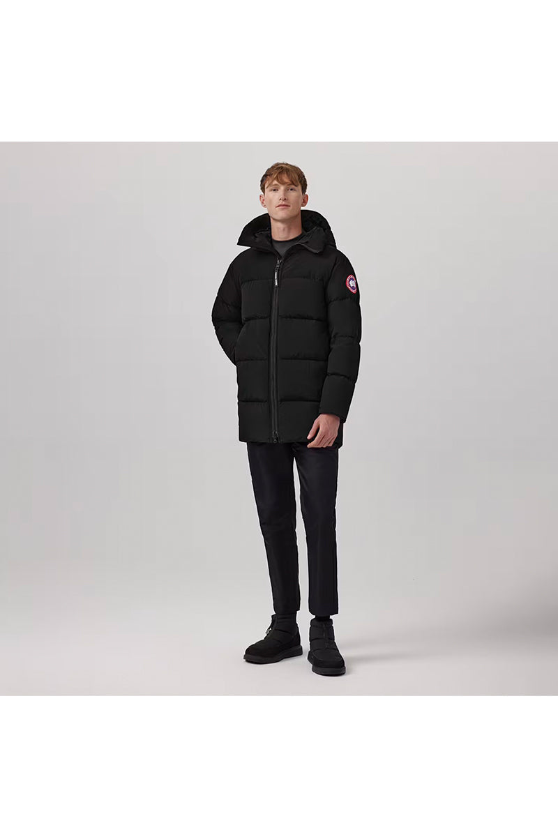 The CANADA GOOSE Lawrence Puffer jacket is an essential for the colder months, padded with premium down filling. This black model features a regular fit, a protective hood, and practical zippered pockets. Its sophisticated construction ensures optimal warmth and a sleek look.