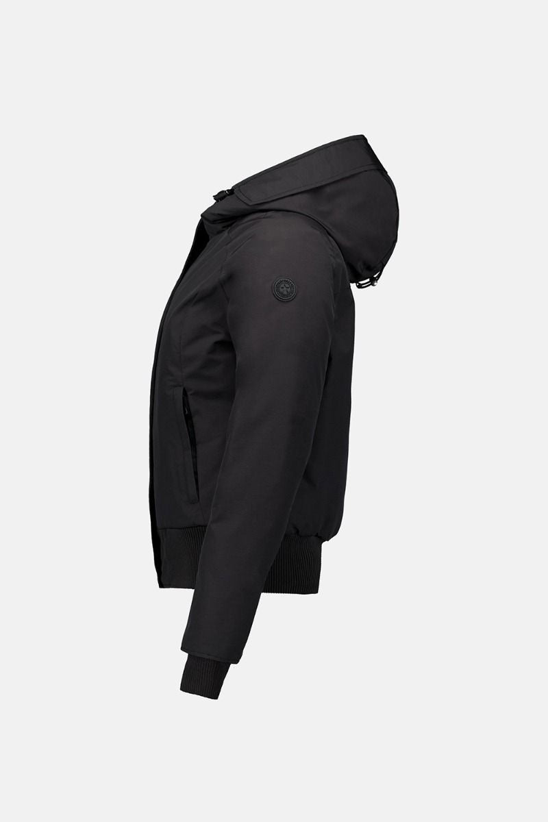 A sleek black bomber jacket from the brand TIP de BRUIN. The jacket has a modern fit and features a comfortable hood with an adjustable drawstring. Two functional zippered pockets are located at the front. The sleeves are finished with ribbed cuffs for a snug fit. A subtle brand logo is visible on the sleeve, creating a refined look.