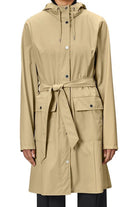 The RAINS Curve W Jacket in Beige is an essential piece, crafted from RAINS' signature waterproof, PU-coated fabric. This A-line style features a tailored fit and features a functional hood with a peak, two patch pockets, and a detachable tie belt to elegantly accentuate the waist. It's a stylish and practical choice that provides protection in changeable weather.
