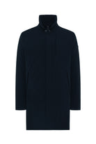 Mid-length coat with a straight fit. Features a stand-up collar and a concealed zip and snap closure. Subtle brand logo on the left sleeve. Double side pockets, concealed in seam details. Back with a vertical seam for a streamlined silhouette.