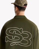 This style features a roomy, oversized fit that complements contemporary streetwear. The jacket closes with a metal zipper. The back features a large, embroidered monogram logo in white outline, creating a striking finish.