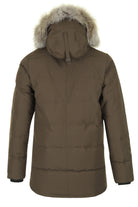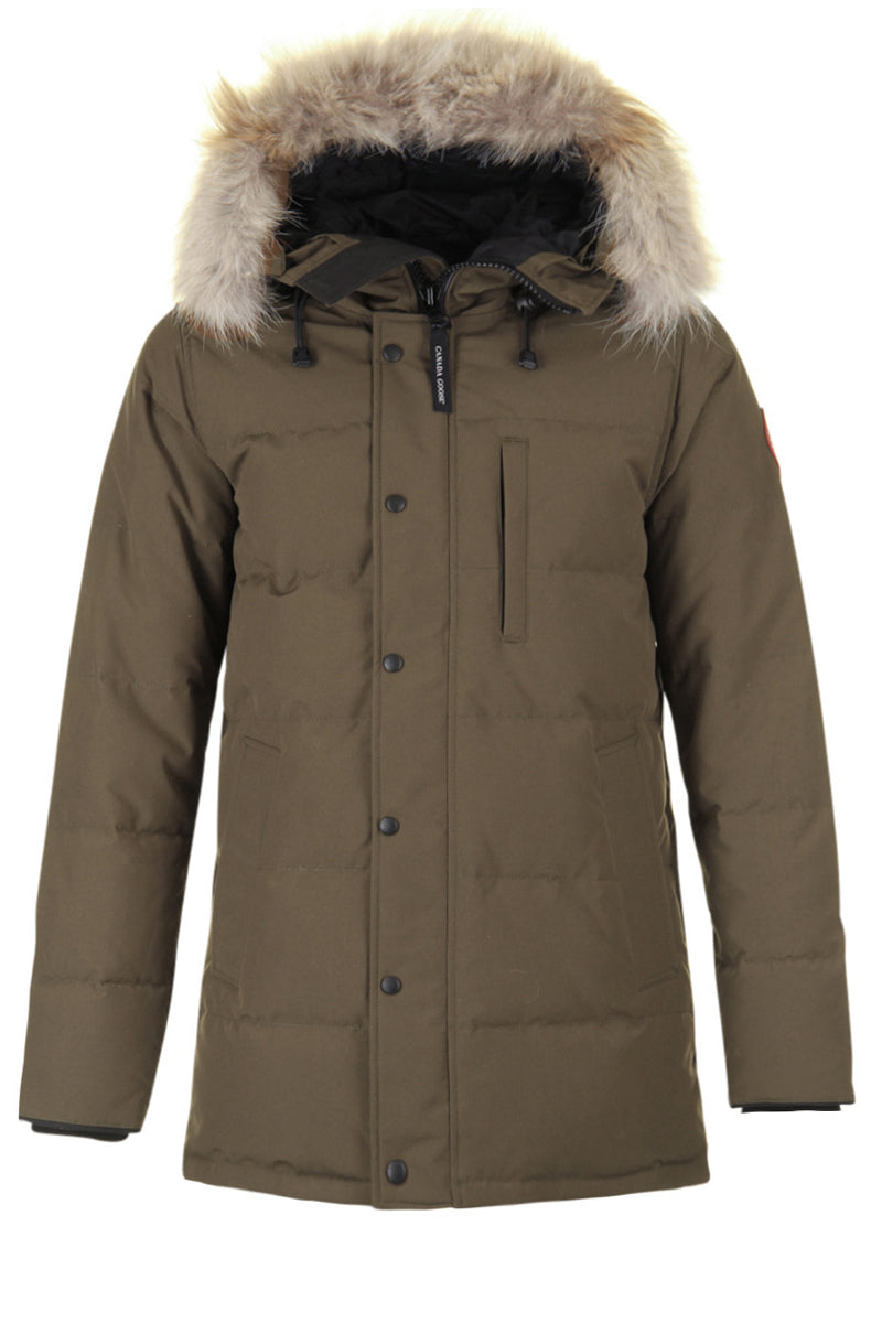 Canada Goose's "Carson" men's parka in army/military green. This classic men's parka is made of durable Arctic Tech fabric, which provides optimal protection against all weather conditions and features a completely water-repellent, windproof, and breathable outer shell. The parka features a "Canada Goose" brand emblem on the sleeve, multiple zippered pockets on each side, a high hood with a detachable fur collar, and a two-way zipper with snaps.