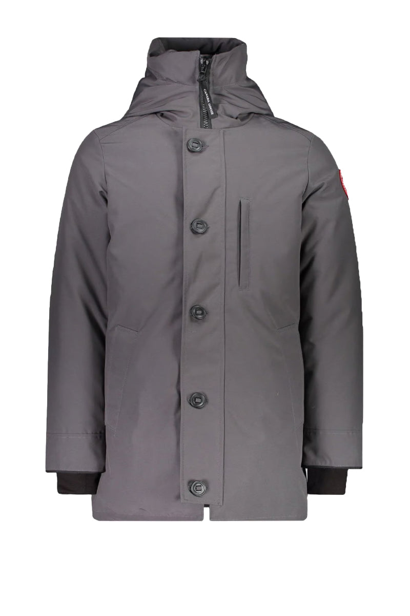 This dark gray CANADA GOOSE CHATEAU PARKA is made of durable Arctic Tech® fabric, designed for extreme cold. The parka features a slim fit and a practical button closure over the main zipper. Visual highlights include a vertical zippered chest pocket, a detachable hood, and black ribbed cuffs. This timeless and functional design guarantees reliable protection from the elements and a sleek look.