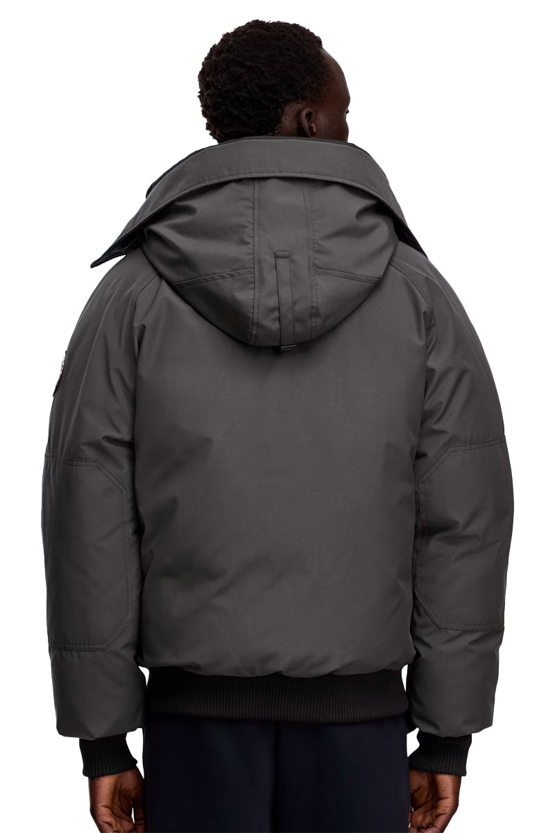 The Canada Goose Chilliwack Bomber is designed for versatility and warmth. This jacket features a modern gray color and classic bomber style. The hood has a drawstring for added protection from the elements. Two large front pockets with flaps offer practical storage, while a pocket on the left sleeve is handy for small items. Ribbed cuffs and hem ensure a snug fit. The secure zipper is accented by a buttoned windproof flap. A subtle logo on the upper arm emphasizes the brand's quality and authenticity.