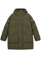This Stone Island jacket offers a modern look with practical details. It features a functional hood and a button closure at the front. Two spacious, slanted pockets with button closures are located at the front. The subtle brand logo is positioned on the left arm. The sleeves and hem are finished with elastic cuffs.