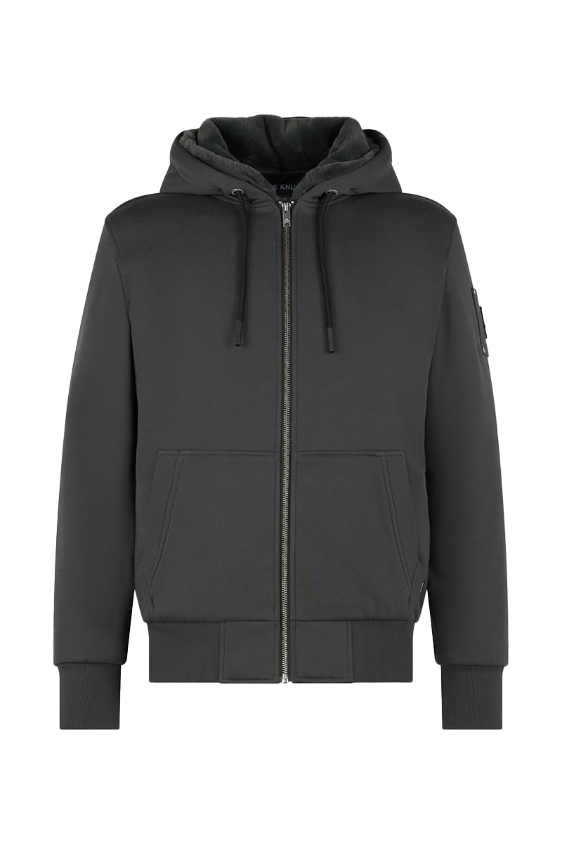 The Moose Knuckles Classic Bunny Jacket in a neutral gray offers a versatile design. It features a full-zip closure and a comfortable drawstring hood. Practical features like two side pockets and an additional zippered sleeve pocket offer ample storage. Ribbed cuffs and hem ensure a neat finish and a perfect fit. See the photos for additional details such as print and design features. This jacket is suitable for a variety of outfits and occasions.