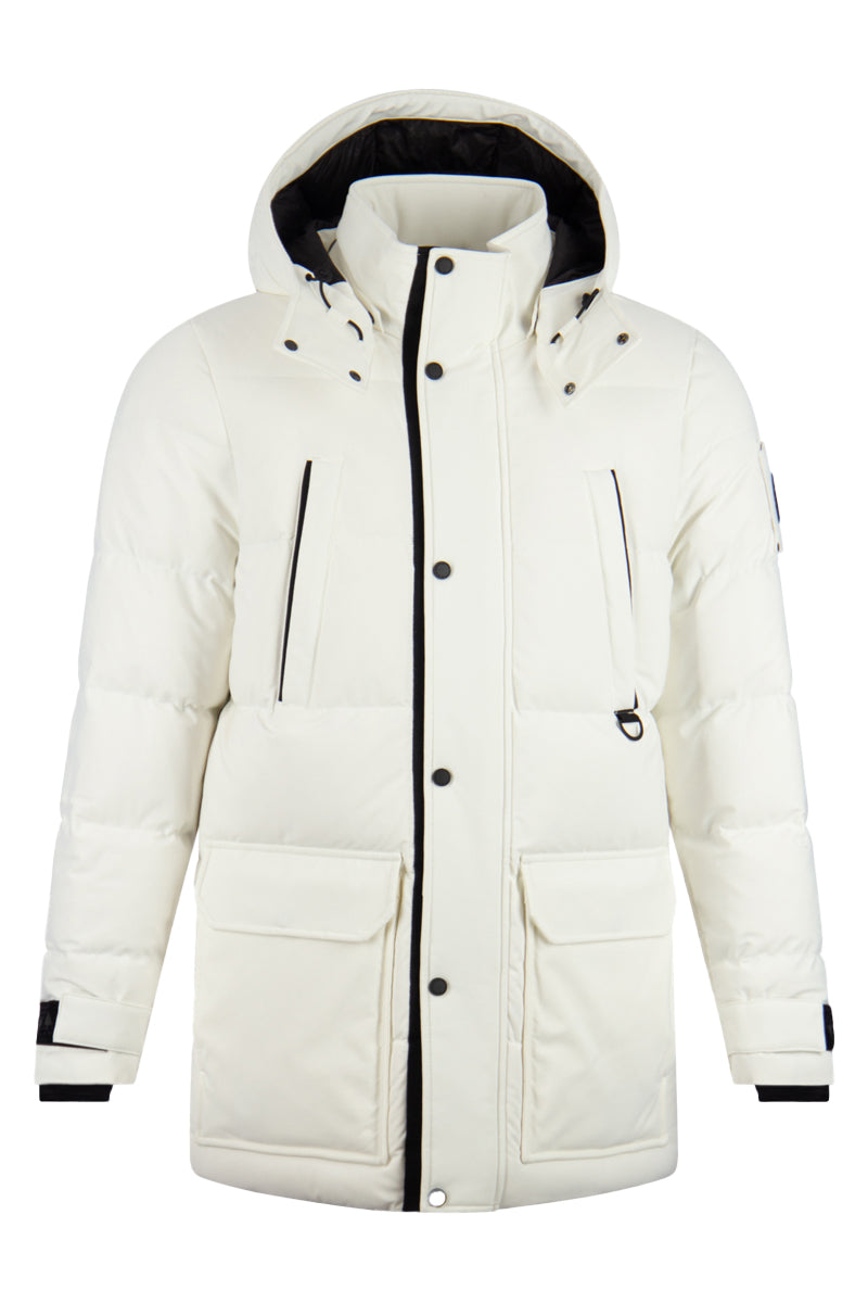 Winter jacket with a quilted structure. Regular fit. Features a protective hood with an adjustable drawstring. Two zippered chest pockets and two large flap pockets at the front. Visible black and white contrasting snap closure. Brand logo on the left sleeve. Elastic cuffs with hook-and-loop closures for a better fit.