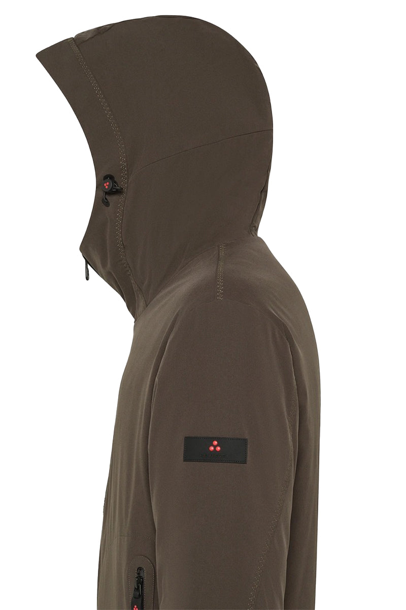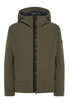 This Peuterey jacket comes in a stylish green hue and falls under the men's jacket category. The design features a hood with drawstrings for adjustability in various weather conditions. The jacket is finished with a full-length zipper and has zippered side pockets for extra storage.