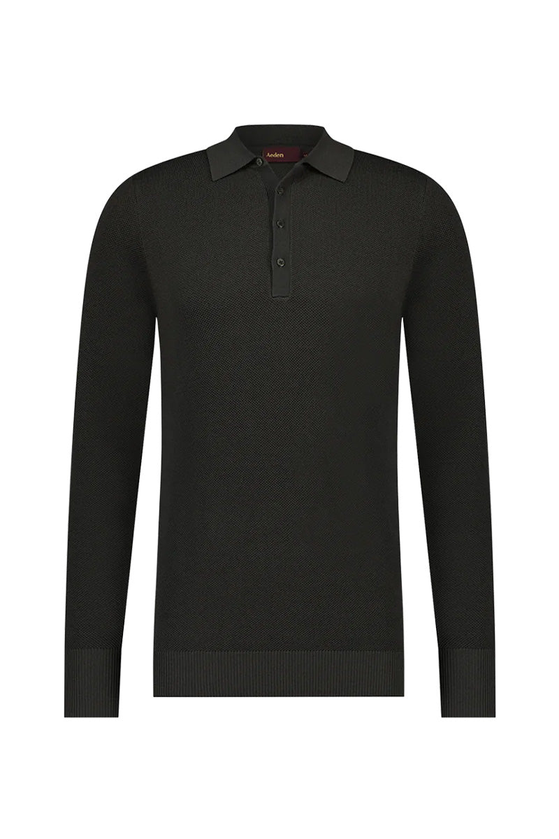 This dark green " Donnel " polo shirt is from Aeden . The knitted polo shirt has three buttons on the front, allowing it to be worn both formally and informally.