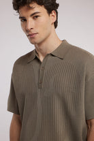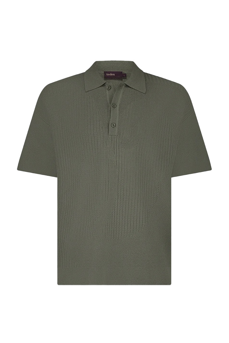 Classic polo shirt with a clean look. It features a ribbed collar and a three-button placket. The shirt has a subtle woven texture with a distinctive pattern. The fit is regular, with short sleeves for a streamlined look.