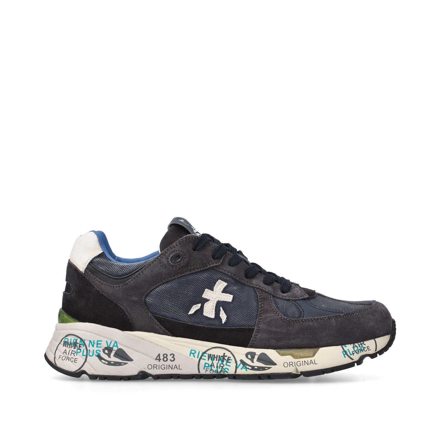 These stylish shoes from Premiata present a modern look with a combination of various materials. The deep blue color gives the shoes a versatile and contemporary look. The upper features contrasting panels and subtle logo accents on the side. The sneaker has a sturdy sole with a unique graphic pattern, offering durability and grip. The lace-up closure contributes to a customizable fit, while the insole provides comfort for everyday wear. See the photos for details such as the design and print.