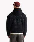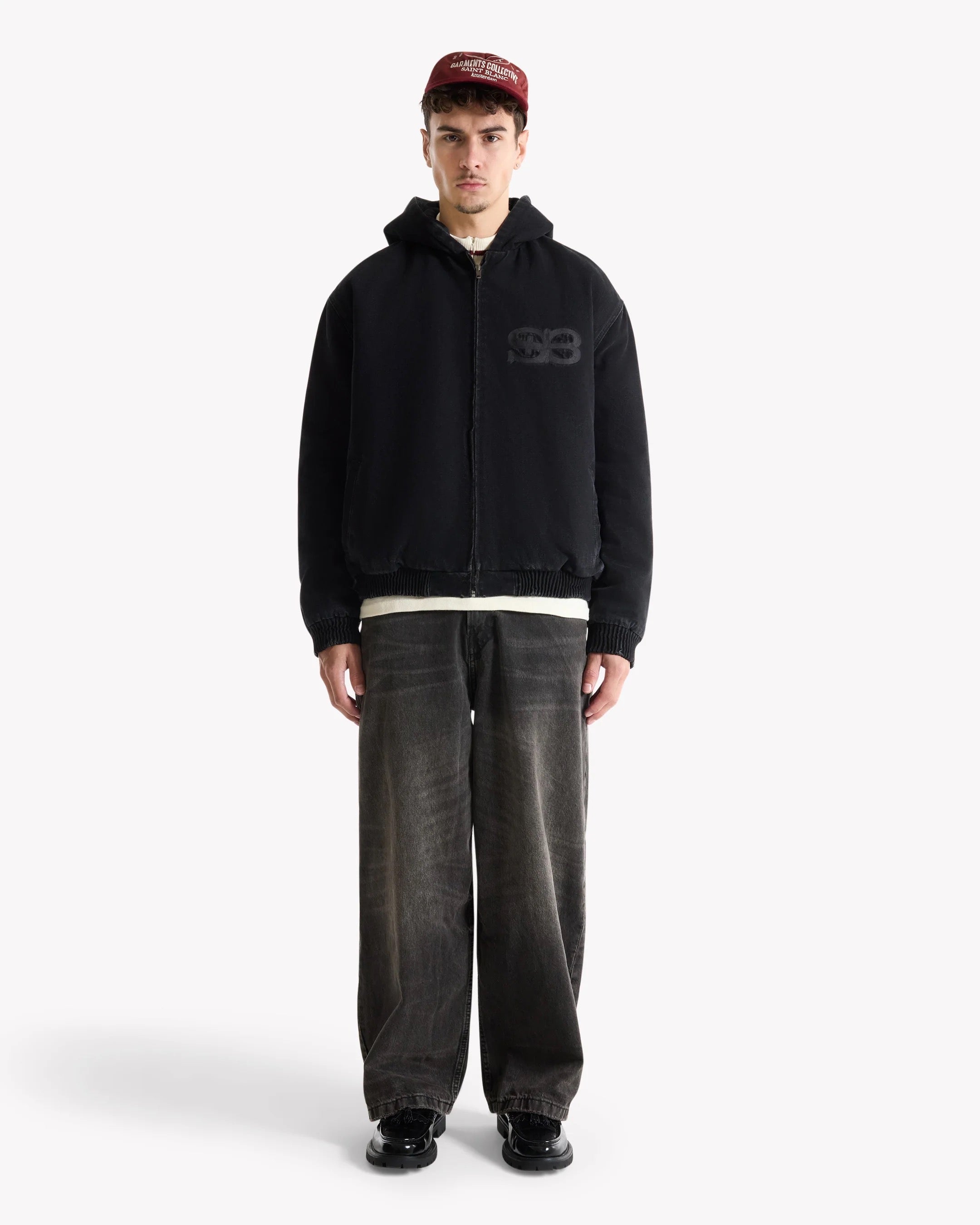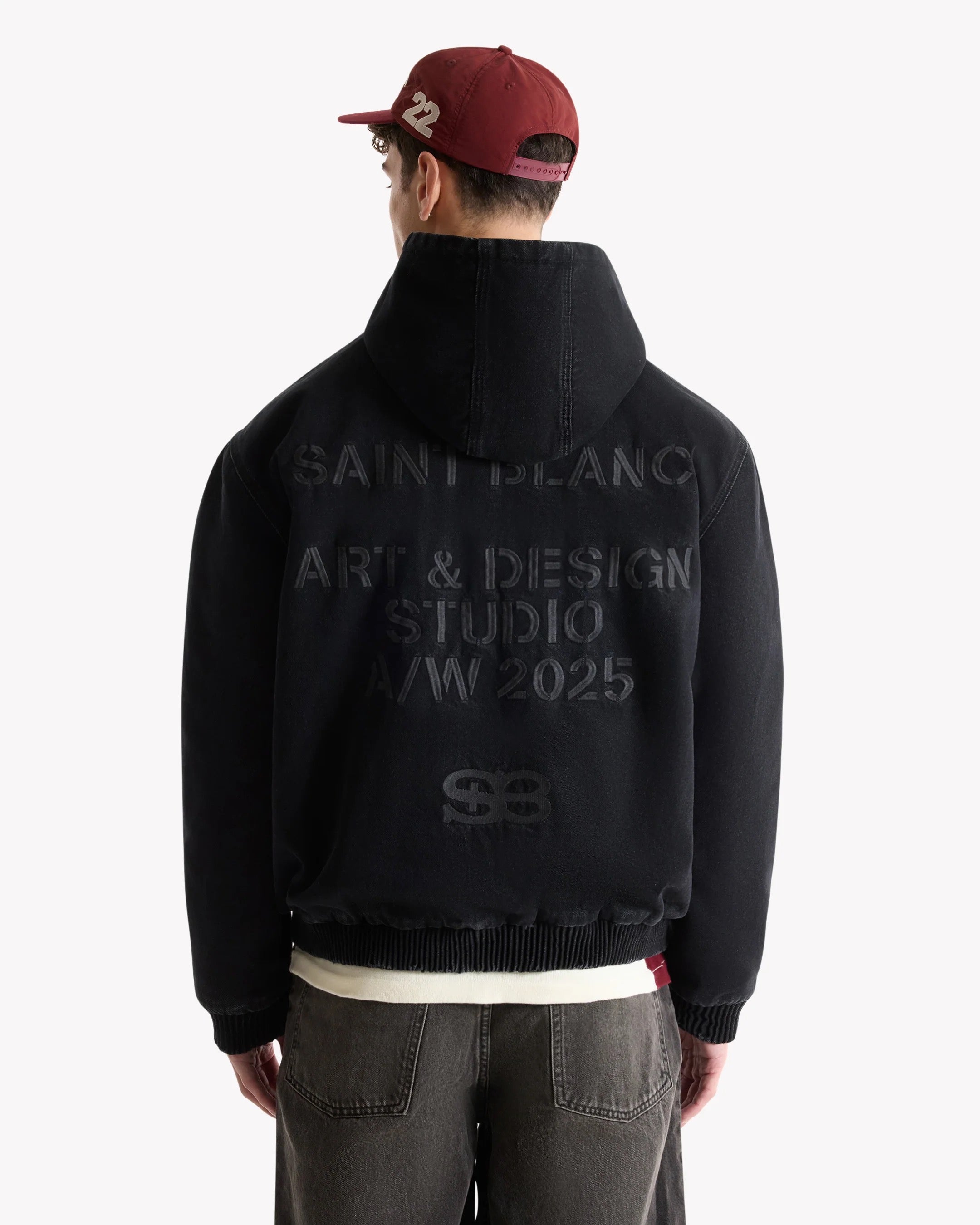 The Saint Blanc JAS STUDIO DENIM BOMBER JACKET BLACK from Saint Blanc is a men's jacket that combines the ruggedness of denim with the sporty style of a bomber jacket. This washed black jacket has a fixed hood and closes with a full zip. Its signature features include a large, tonal "SB" logo on the chest and a striking relief print on the back with the text "SAINT BLANC ART & DESIGN STUDIO A/W 2025."