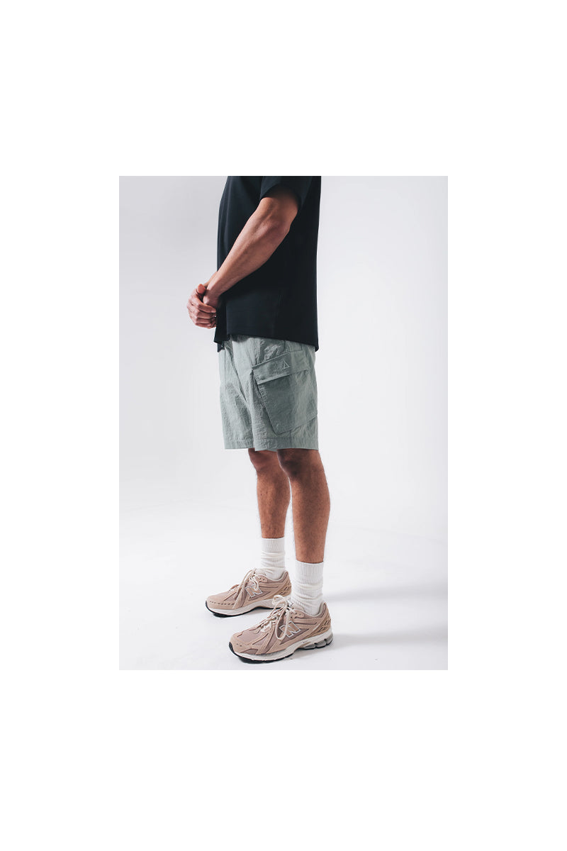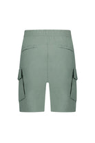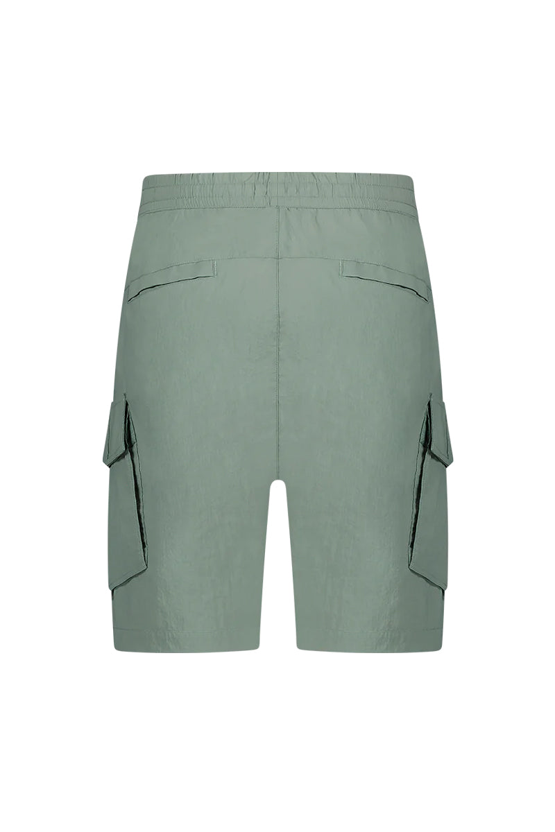 Casual shorts in a subtle light green hue. These Aeden shorts have a relaxed fit and feature multiple practical pockets, including spacious cargo pockets on the sides. The elastic waistband with drawstring ensures an adjustable fit. The design features a minimalist logo on the waistband for a modern look. These shorts are versatile and can be paired with a T-shirt or a lightweight sweater.