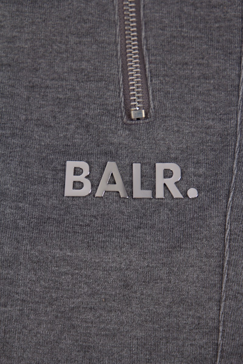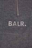DK heather grey shorts from the brand BALR . The shorts are made of an extra-heavy cotton blend and have three zippered pockets. There's a drawstring at the waist, and the familiar BALR. logo is on the right leg.