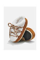Moon Boot mules with a warm shearling lining for everyday wear. The upper is light brown with a contrasting lace-up closure. They feature a grippy sole and a subtle logo on the side. Designed for comfortable wear indoors or outdoors.