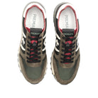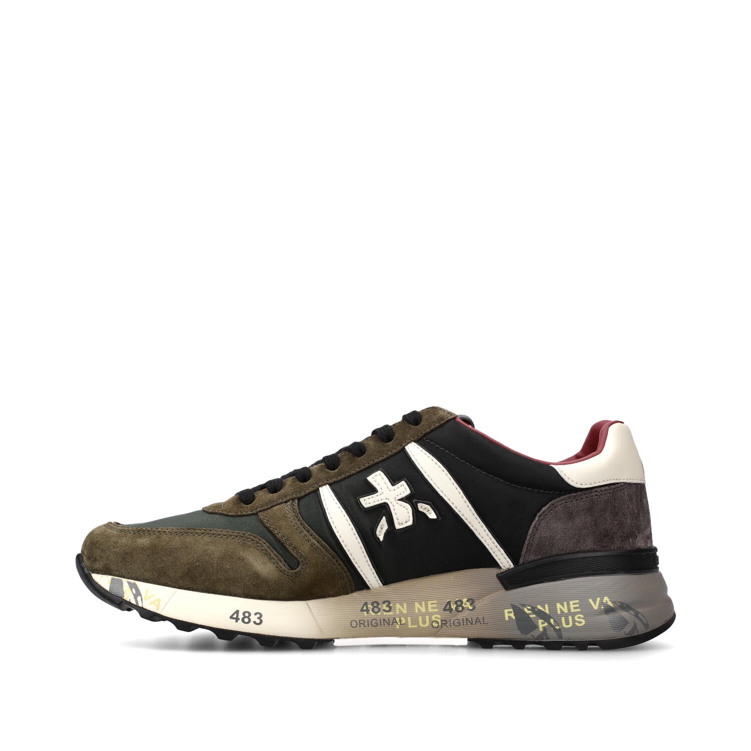 The Premiata Lander shoes are designed with a modern aesthetic and a detailed design. The upper combines various fabrics in shades of green and black, complemented by white accents and a contrasting red lining. A subtle logo on the side of the shoe is a signature feature. The shoe features a sturdy sole with original prints and offers durability and grip. The combination of colors and textures creates a versatile look that pairs well with various clothing styles.