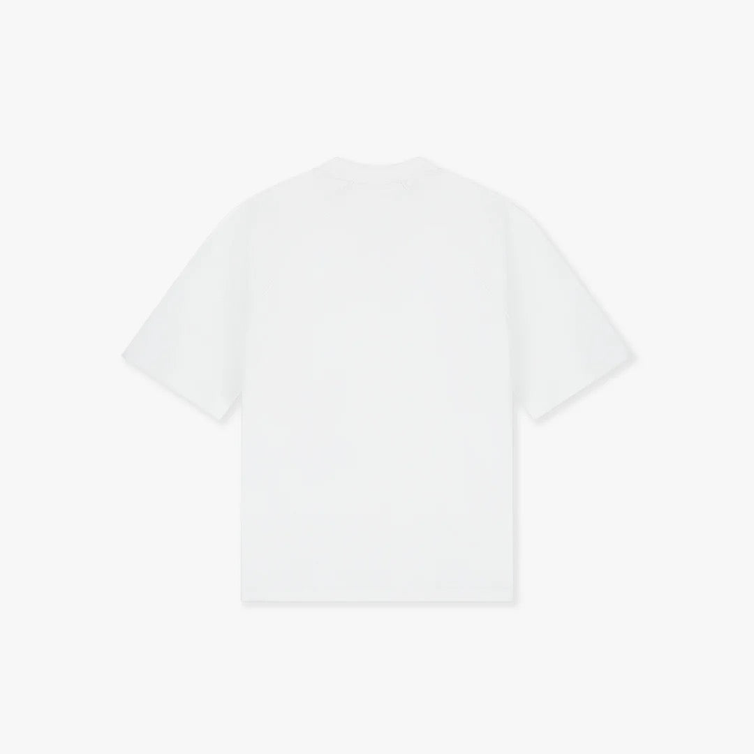 The CROYEZ RAGLAN T-SHIRT OFF WHITE is a signature piece from the Croyez collection. This bright off-white T-shirt stands out with its sporty design featuring raglan sleeves and a slightly raised crew neck. The brand identity is prominently displayed with a burgundy-colored arch print on the chest, which features the text "CROYEZ ATELIER PARIS."