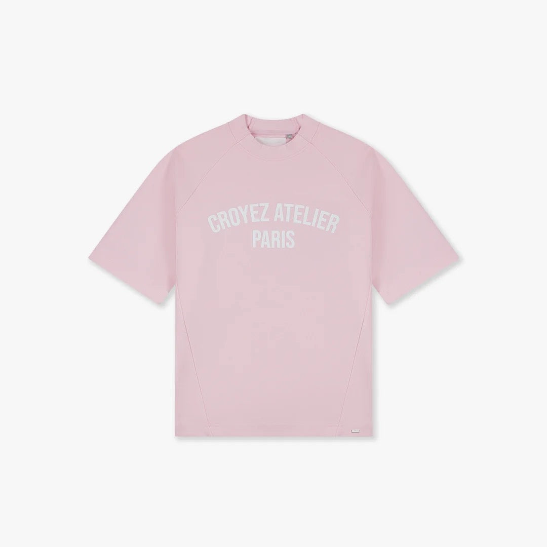 The CROYEZ RAGLAN T-SHIRT PINK is a striking piece from the Croyez brand. This pink shirt features sporty raglan sleeves and a fitted, high neckline. The contrasting white "CROYEZ ATELIER PARIS" text is printed centrally on the chest, creating a clear brand identity.