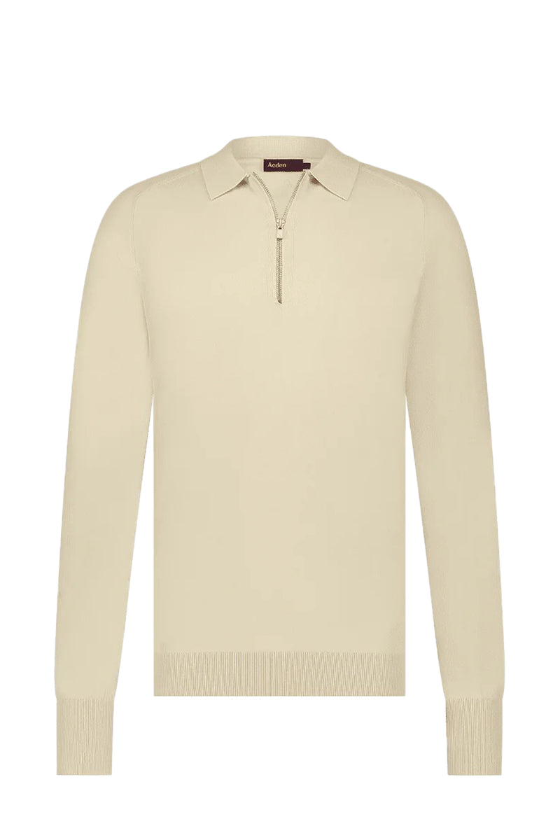 Stylish Aeden sweater in a sand-khaki color. It features a zipper at the neck for easy adjustment. This sweater has long sleeves with ribbed cuffs for a neat finish. The classic design offers versatility and is suitable for various occasions. Subtle brand details add an extra touch without being overpowering.
