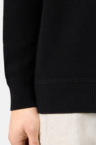 This sweater from the Stone Island brand falls into the categories Shop, Sweaters & Cardigans, and Brands. The garment features a classic round neckline and long sleeves. The sweater is designed in a deep black color, tailored to modern style needs. The characteristic Stone Island logo is prominently featured on the left sleeve, embroidered on a detachable brand emblem. This detail emphasizes the design's unique flair. Ribbed cuffs and hem provide a neat finish. See the available photos for more details on color, print, and pattern.