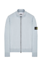 This full-zip sweater offers practical and stylish options. It features the signature Stone Island logo on the sleeve. It comes in a light, solid blue. Ribbed hem and sleeves provide a neat finish. Minimalist and functional design. Photos provide further insight into the color and detailing.
