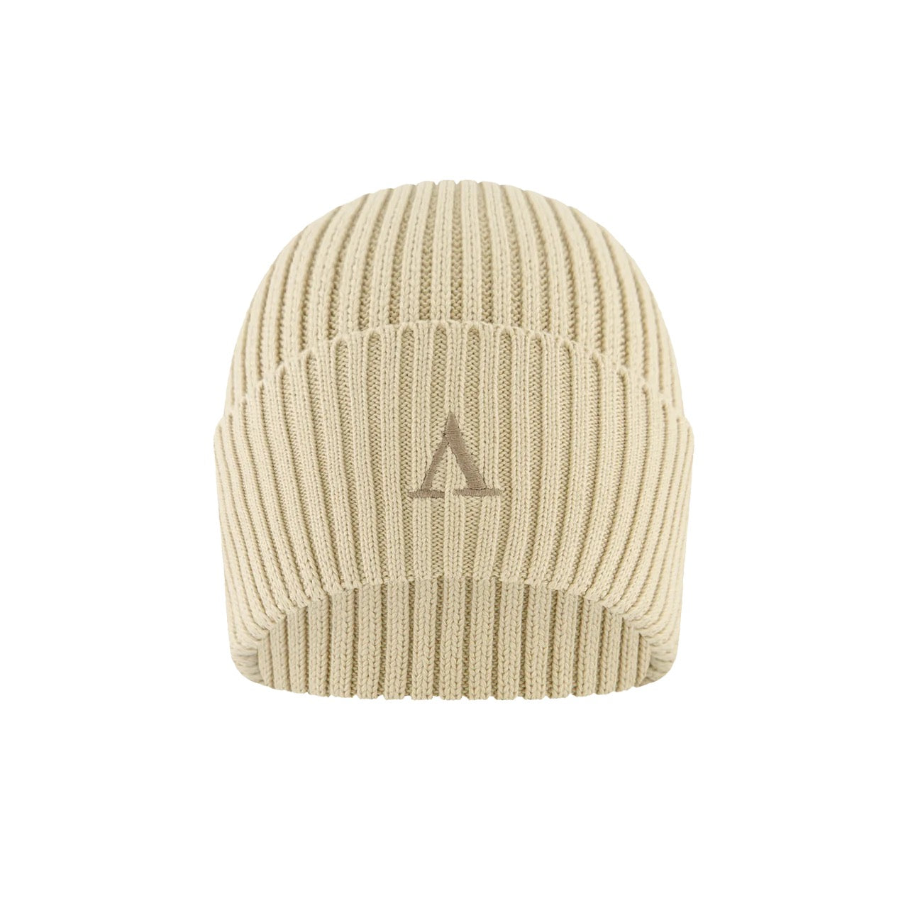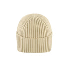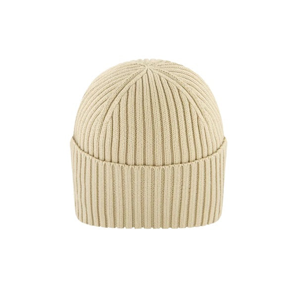Ribbed knit beanie with a turn-up, suitable for everyday wear. It features a subtle brand logo print on the front. This beanie offers a simple and timeless look in a versatile color. Ideal for use in different seasons.