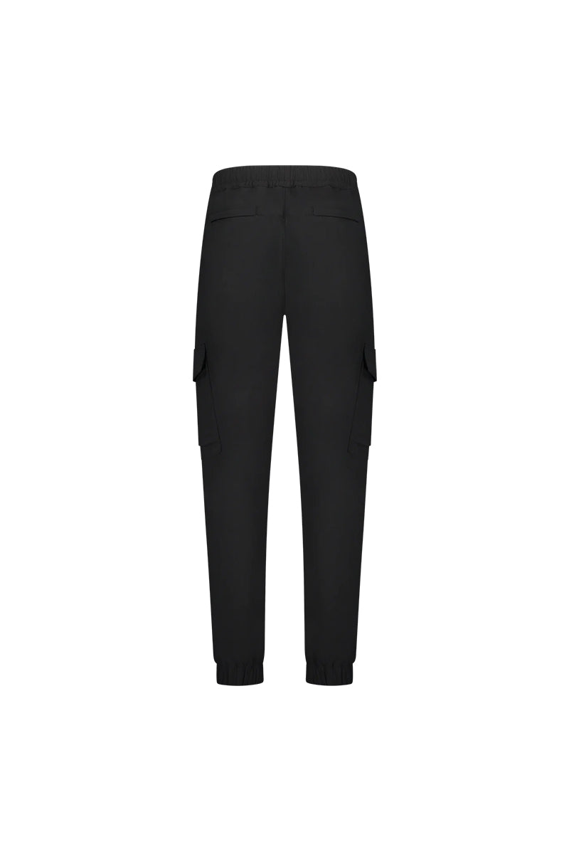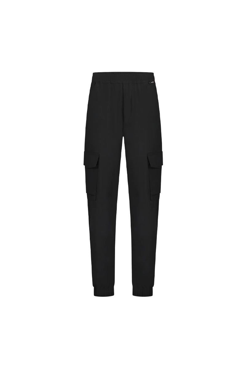 A straight fit with an elasticated waistband for optimal comfort. Featuring cargo pockets on both sides and slanted side pockets, they're ideal for practical use. Two back pockets with flaps. The subtle branding on the waistband adds a refined touch.