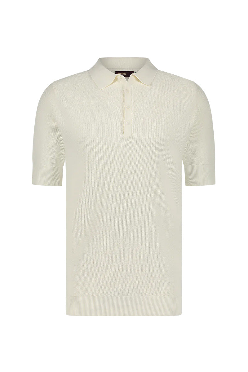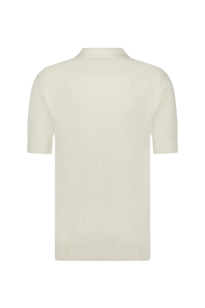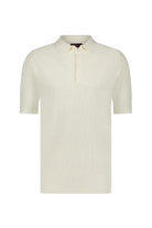 Stylish polo shirt with short sleeves and a classic collar. Three-button placket at the front. Ribbed cuffs and hem. Soft and lightweight fabric for optimal airiness. Timeless off-white color. Delicately woven texture creates a subtle pattern. Small brand logo subtly incorporated on the inside of the collar.
