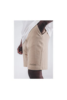 Short style with an elasticated drawstring waistband. A secure fit. Two slanted pockets at the front and a back with a discreet patch pocket. The subtle Aeden brand name is embroidered on the left hem. Ideal for everyday wear.