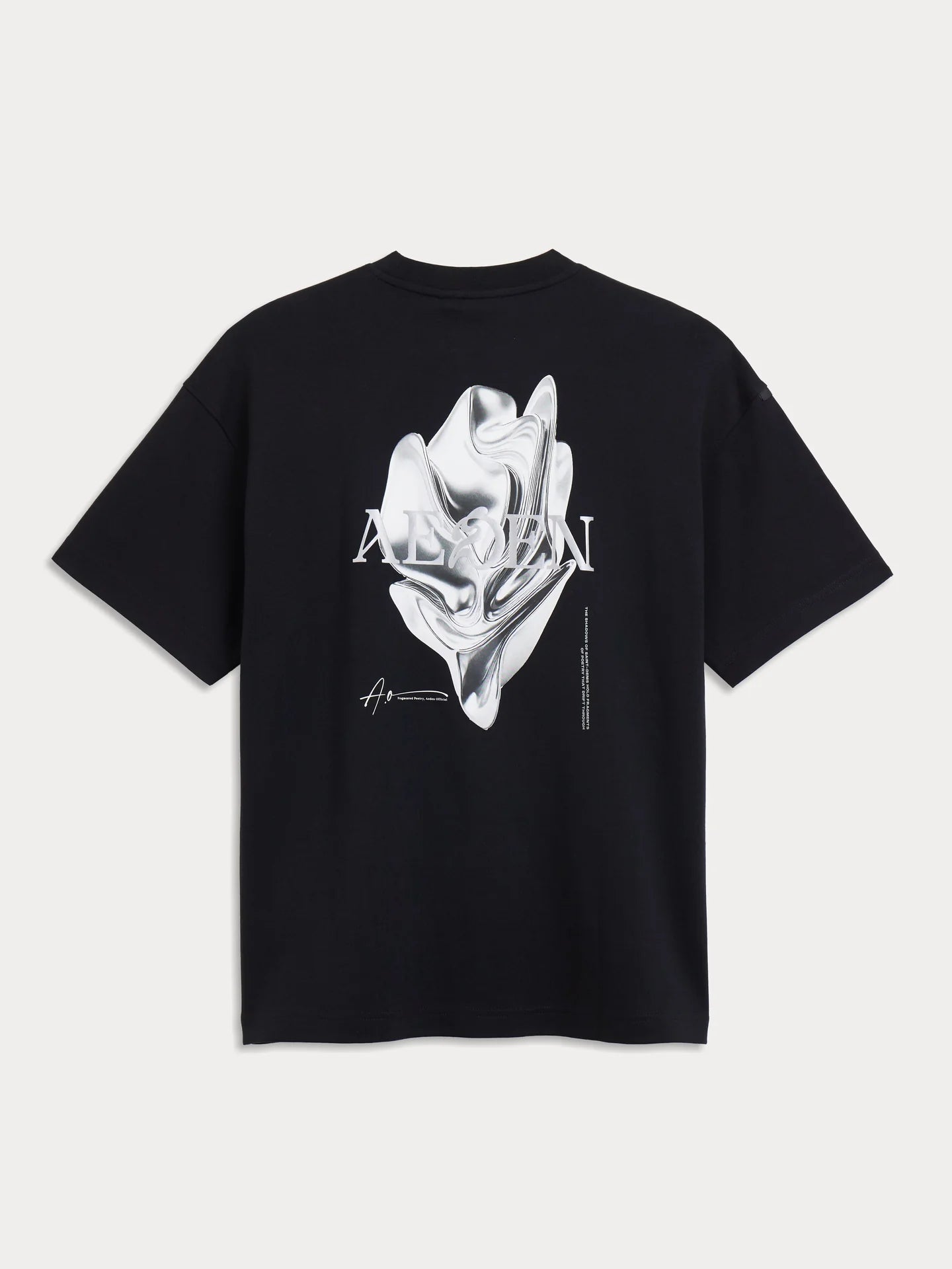 This black AEDEN T-shirt features a striking silver print on the back, featuring an abstract shape combined with the brand logo. It features short sleeves and a round neckline. The fit is regular and suitable for a variety of styles. It's made without visible detailing on the edges, allowing the focus to be on the design. This T-shirt pairs well with jeans or shorts for a versatile look.