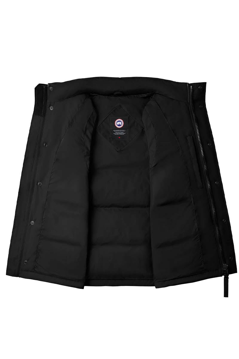 A functionally designed bodywarmer with clean lines. The signature Canada Goose logo is embroidered on the chest. It features a high stand-up collar and snap closures at the front. Two large front pockets with hook-and-loop closures and an additional zip pocket for easy storage. The internal fit allows for freedom of movement. Color: deep black.