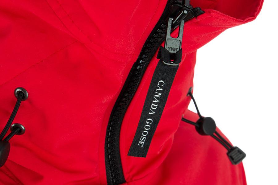 The parka is a hip-length model with a regular fit. It also features side zippered pockets with fleece linings to keep your hands warm, a high hood with a chin guard, a rain flap, and an elastic drawstring to keep out wind and rain, a double two-way zipper with a wind flap, and a Canada Goose brand emblem on the sleeve.