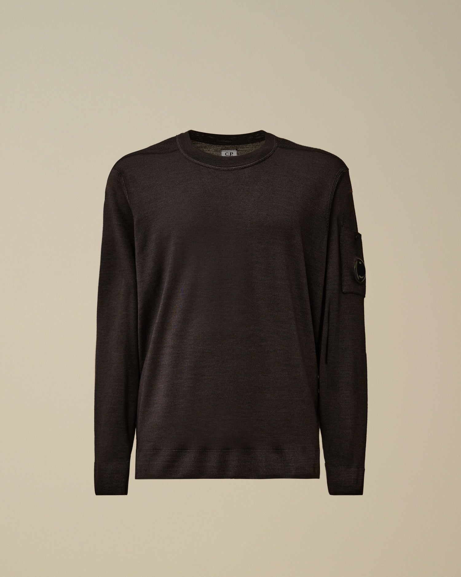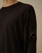 The sweater has a straight fit (Regular Fit). The finish features ribbed cuffs, hem, and a ribbed collar. Its most distinctive detail is the functional utility pocket on the left arm. This sleeve pocket features the iconic, round CP Company lens detail, emphasizing the brand's character.
