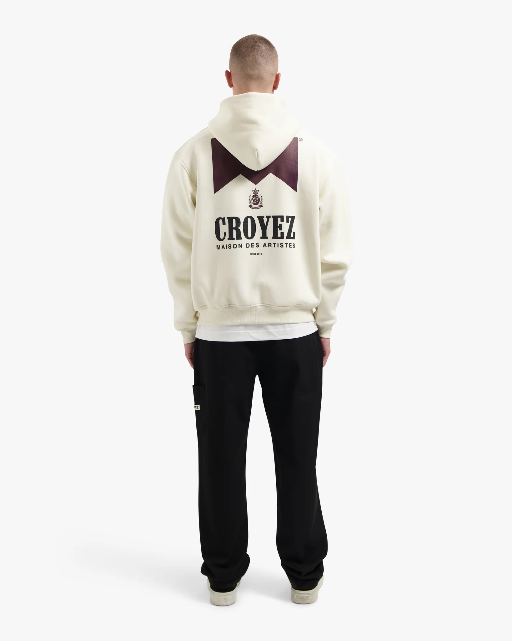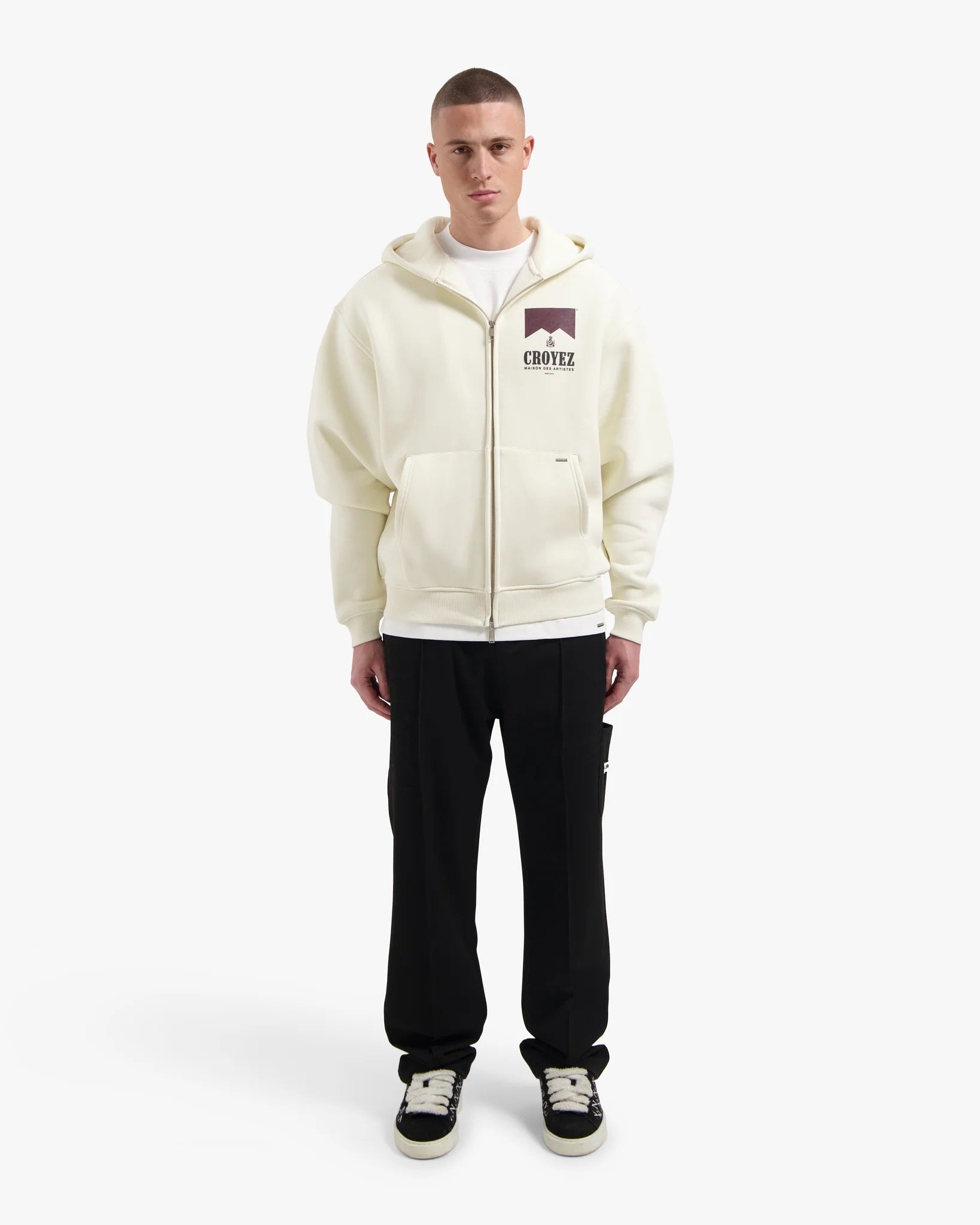 The CROYEZ SWEATER MAISON FUMES ZIP HOODIE OFF WHITE is a striking addition to the Croyez collection. This zip hoodie, in Off White, features printed "Maison Fumes" branding. A compact logo is visible on the left chest, while a larger, complementary print adorns the back. The design is contemporary and combines street elements with a luxurious look.
