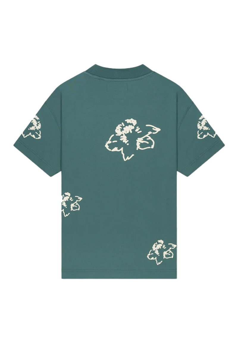A modern T-shirt with a relaxed fit and short sleeves. It's green with a subtle floral print on both the front and back. It features a crew neck and a discreetly placed logo on the chest. Perfect for pairing with other casual pieces for a versatile style.