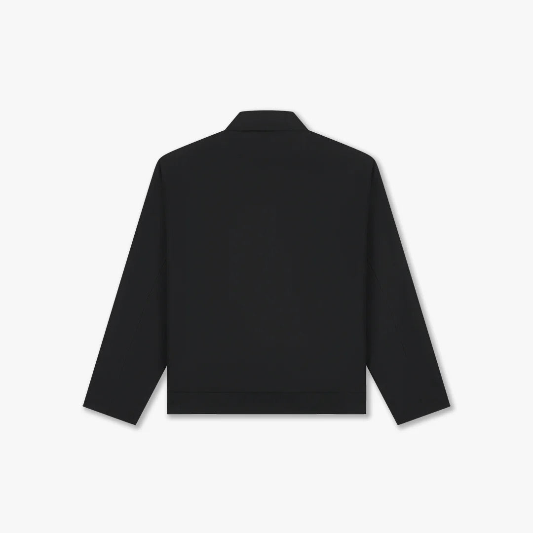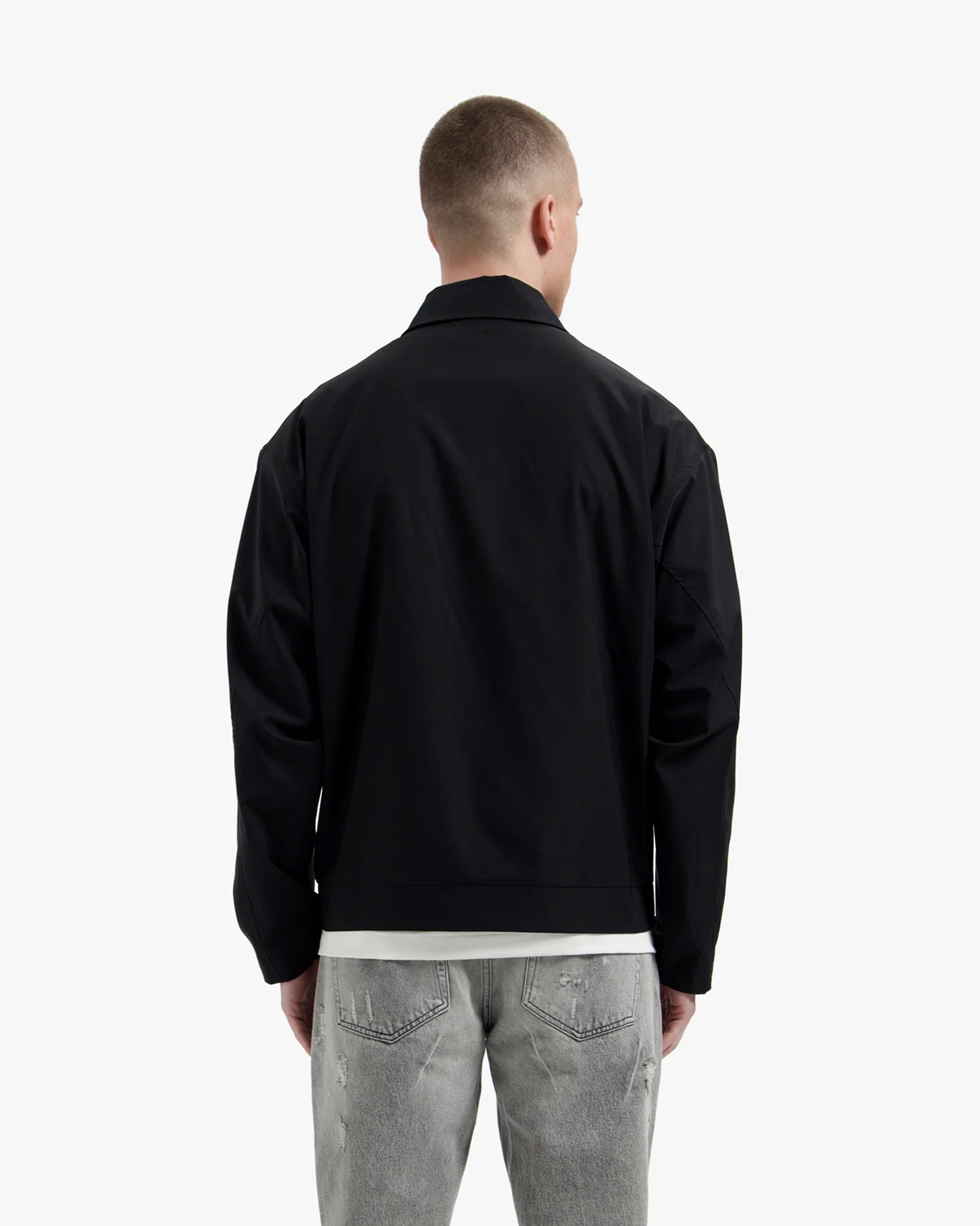 The CROYEZ T-SHIRT PATCH JACKET BLACK is a versatile men's jacket from CROYEZ . This black jacket features a minimalist, work jacket-inspired design and a classic, flat pointed collar. The design is completed by a small, square woven patch logo on the left chest, in the brand's signature red, white, and blue colors.