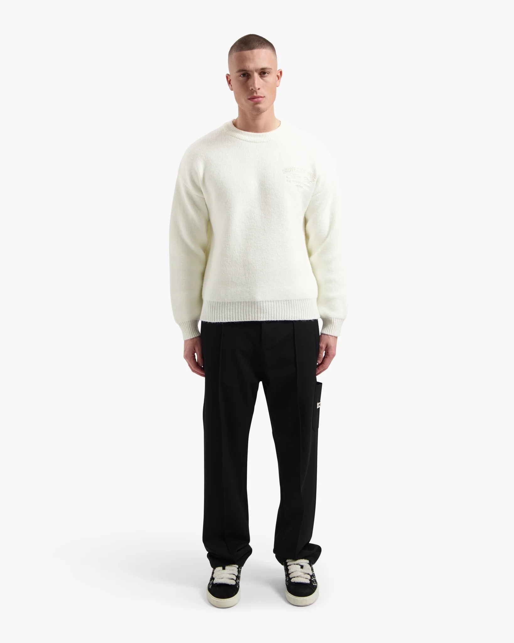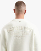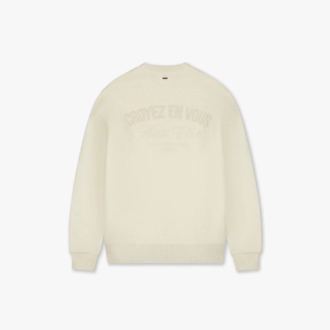 The CROYEZ TRUI EN VOUS KNIT SWEATER OFF WHITE is a stylish knitwear garment from Croyez . This Off White sweater has a classic crew neck. The subtle tone-on-tone embroidered lettering "CROYEZ EN VOUS" is a distinctive feature of the design, appearing on both the chest and back.