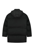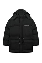 Black jacket with a quilted design. Straight fit. Detachable hood with button closure. Two large front pockets with drawstring details. Subtle logo on the chest. Front zip closure.