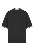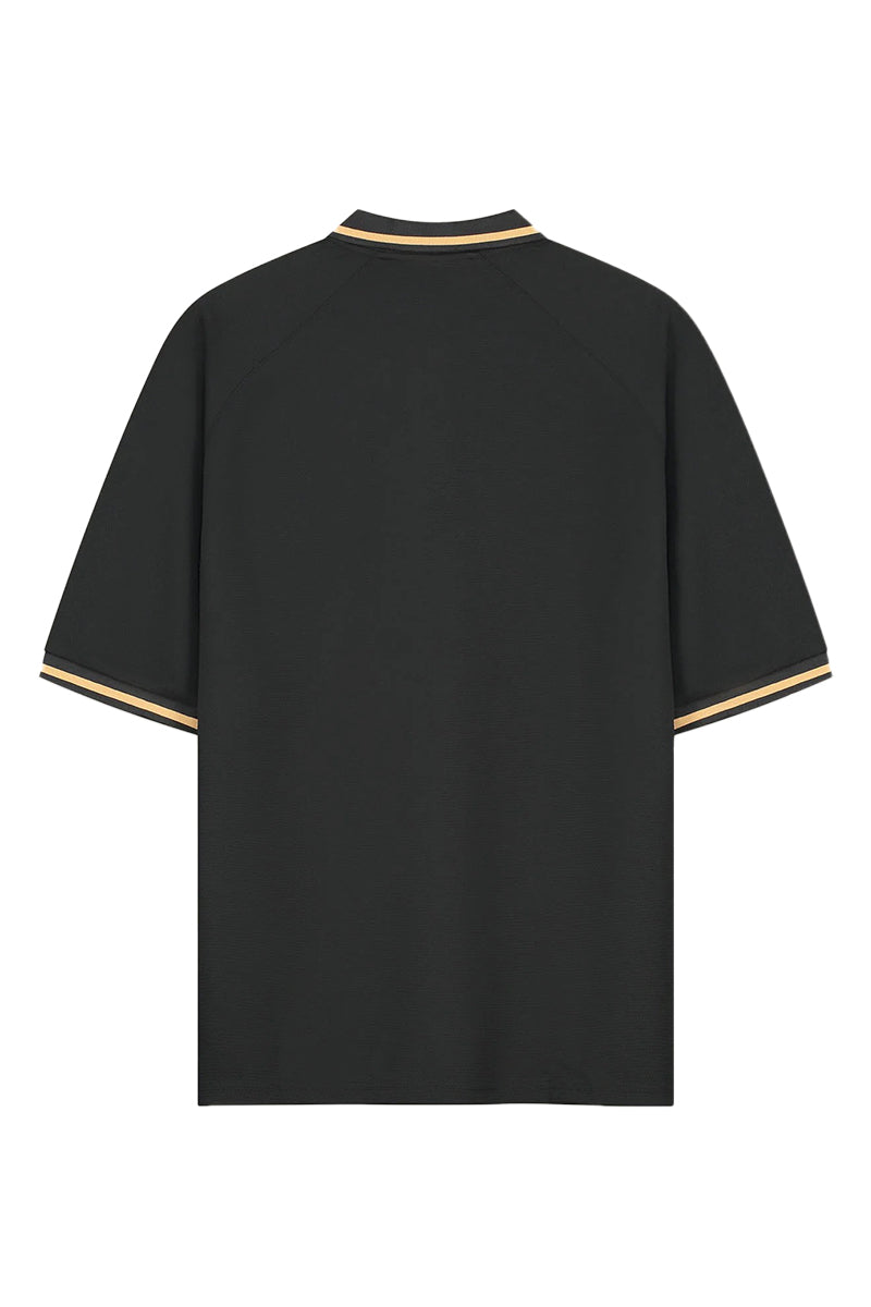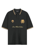 This polo shirt has a modern fit with short sleeves. The black design features gold prints, including a striking embroidered emblem on the chest and a subtle logo detail. The collar and cuffs are finished with a contrasting gold stripe for a sporty look. Available in the Don't Waste Culture brand.