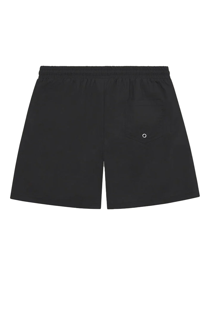 Relaxed-fit shorts. Elastic waistband with drawstring for adjustable comfort. Two side pockets and a back pocket for added functionality. Subtle logo at the bottom of the left leg. Available in black.