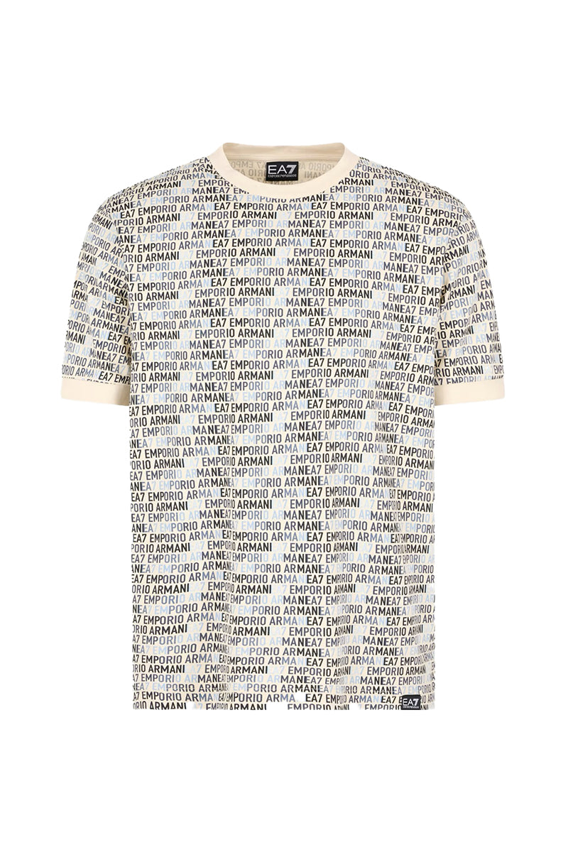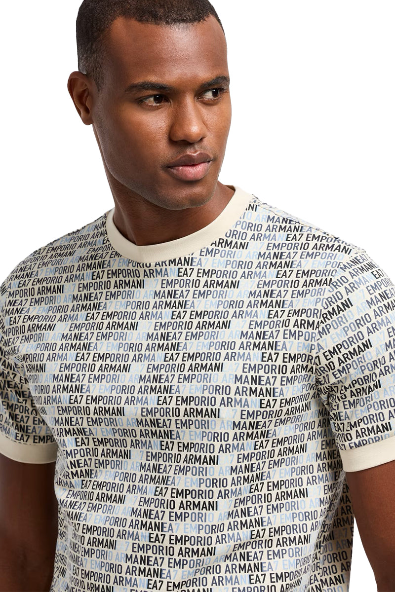 Classic crew neck T-shirt with short sleeves. All-over EA7 Emporio Armani logo print in contrasting colors. Regular fit. The hem and cuffs are finished with a subtle border in the same color, creating a cohesive look.