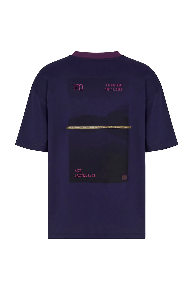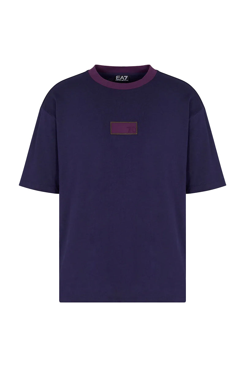 The EA7 T-shirt features a generous fit and is available in blue. It features a crew neck and short sleeves. A subtle stitched logo is featured on the chest, while the back features a large graphic print, including the recognizable EA7 logo. The contrasting collar and rich color accents create a contemporary look. This T-shirt is versatile and versatile, complementing a variety of styles and offering a modern update to any wardrobe.