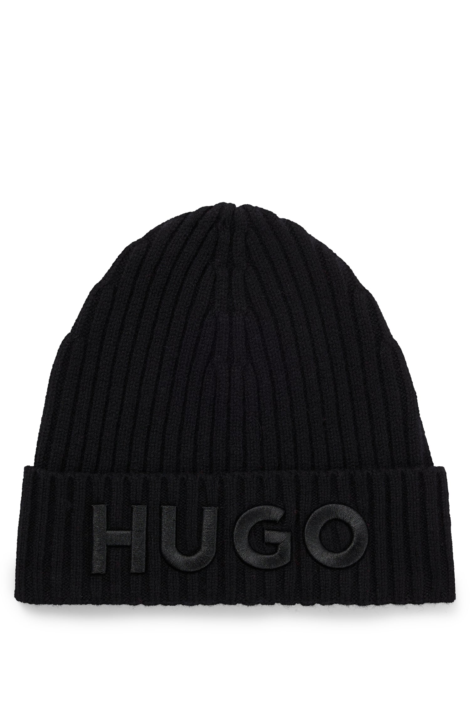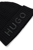 Black beanie with a ribbed knit texture. It features a striking, large HUGO logo on the turned-up brim. A one-size-fits-all design for seamless everyday wear. An essential accessory for every season.