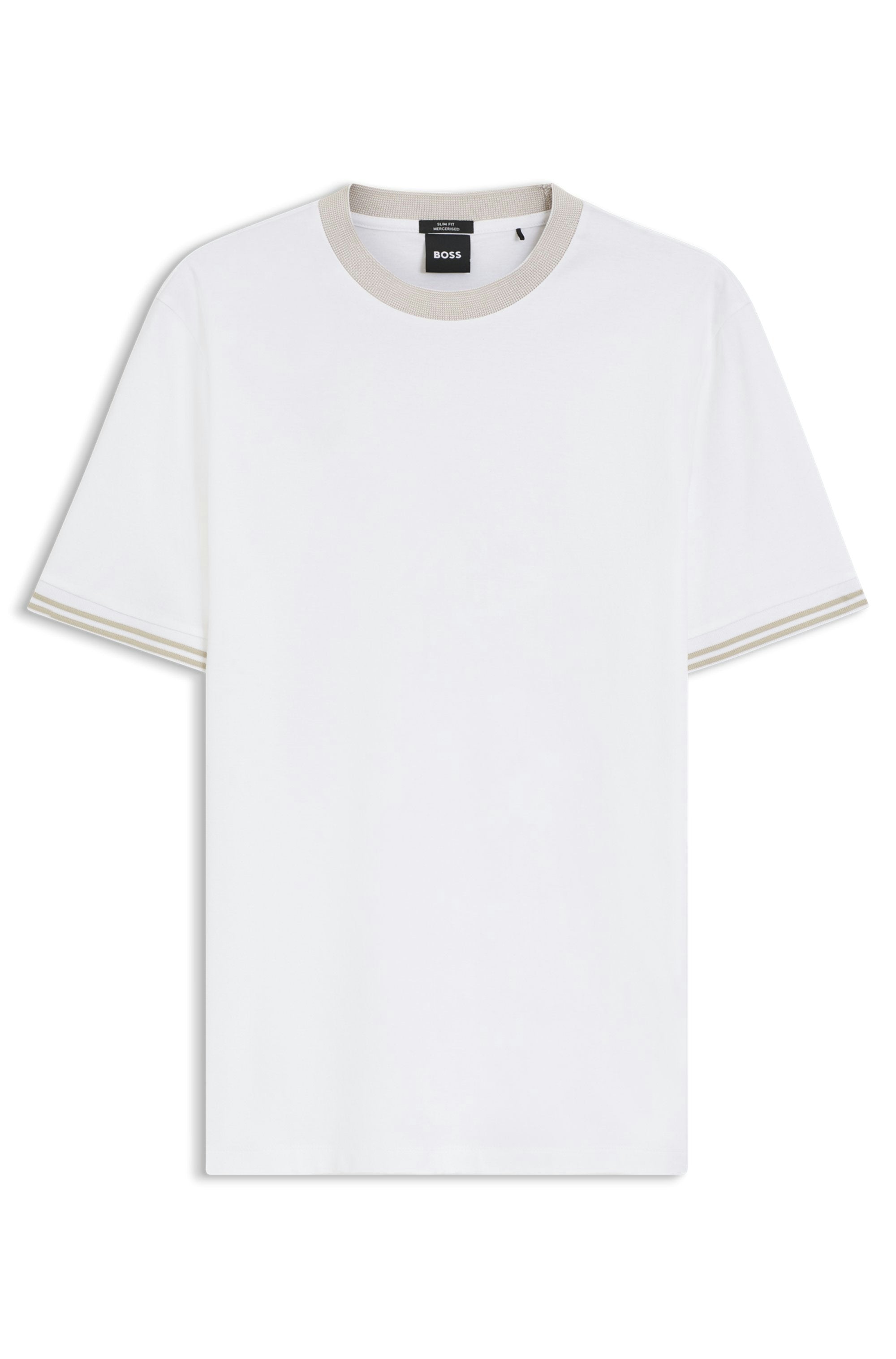 Het HUGO BOSS T-SHIRT H-TESSLER238 WIT van Hugo Boss is een stijlvol kledingstuk met een luxe uitstraling. Dit witte shirt heeft een modern ontwerp met subtiele contrasten bij de hals en de mouwen. De kraag en de boorden zijn afgewerkt met een beige structuur en fijne strepen, wat het shirt een uniek en verzorgd karakter geeft.