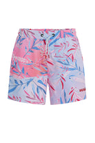 Swim shorts with an adjustable waistband. Elastic waistband with drawstring for a personalized fit. Two side pockets and one back pocket with a hook-and-loop closure. Tropical print in various shades of pink and blue. Subtle brand logo on the left leg.