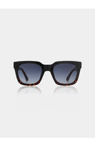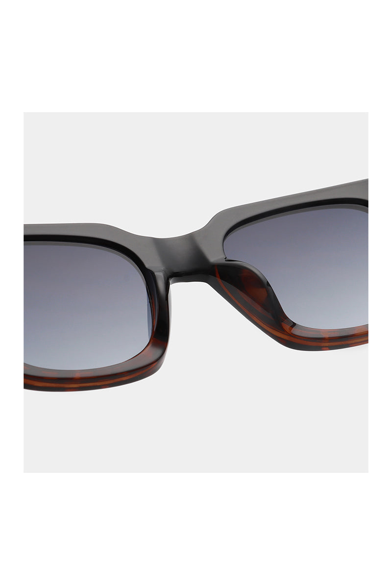 Modern A. Kjaerbede sunglasses with square frames. Clean lines in classic black with brown accents on the rims. The sunglasses offer UV protection and have dark, slightly tinted lenses for comfortable vision. The brand's logo is subtly embossed on the inside of the temples. The sturdy hinges ensure durability and longevity.